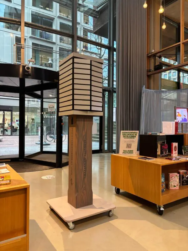 De kast is geïnspireerd op de uitgesproken architectuur van de Bijlmer en opgebouwd uit strakke horizontale lijnen die verwijzen naar de iconische balustrades van de Bijlmerflats. Met enthousiasme is deze kast ontvangen door de OBA en is nu voor iedereen te bewonderen en gebruiken.