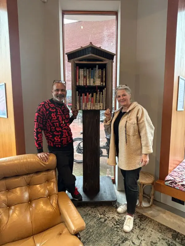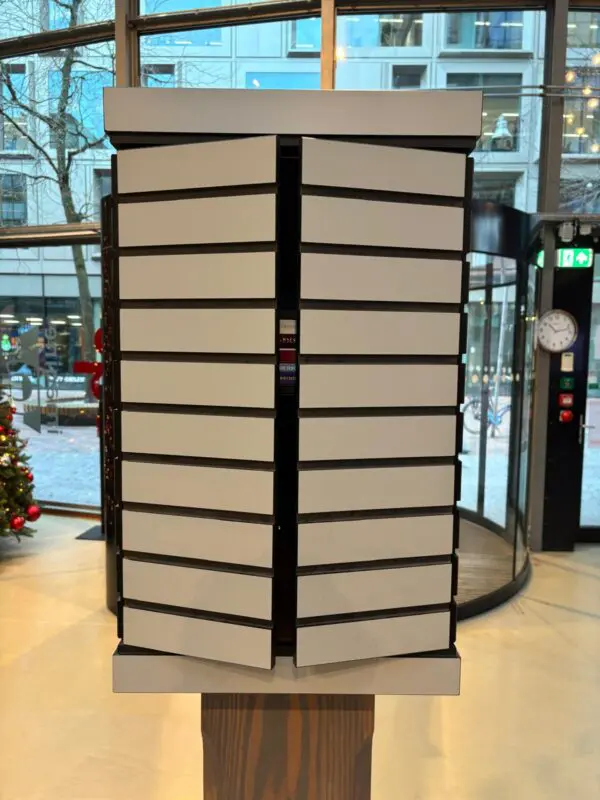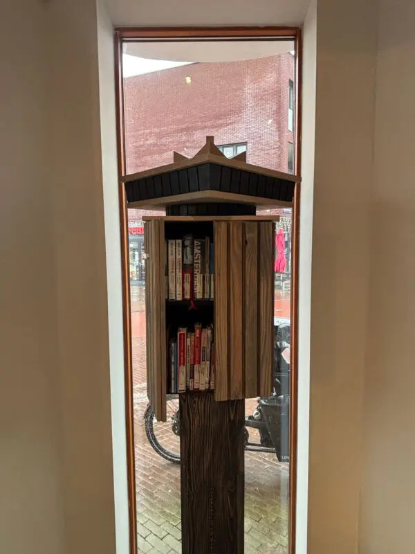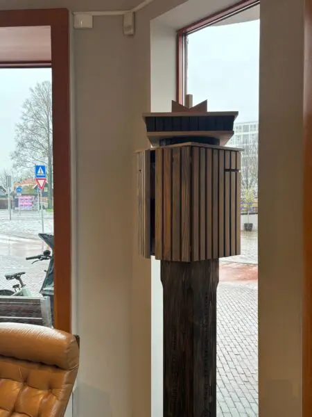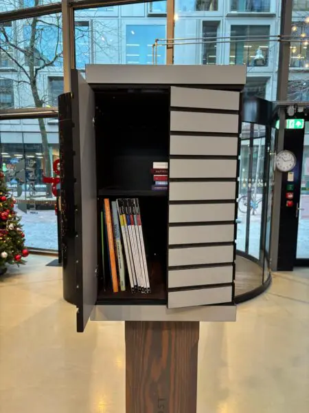 Net ná de kerstvakantie is de volgende kast alweer geplaatst. Dit keer kenniskast Noord. Wederom overhandigd door ontwerper Sjoerd Vroonland. Deze kast heeft een plek gekregen bij de OBA Van der Pek. Het ontwerp is gebaseerd op de A’DAM Toren, wat terug te zien is aan het strakke, verticale en krachtige silhouet. Vanuit buiten is de kast al goed te zien. Met zijn prominente plek voor het raam is dit echt een eyecatcher.