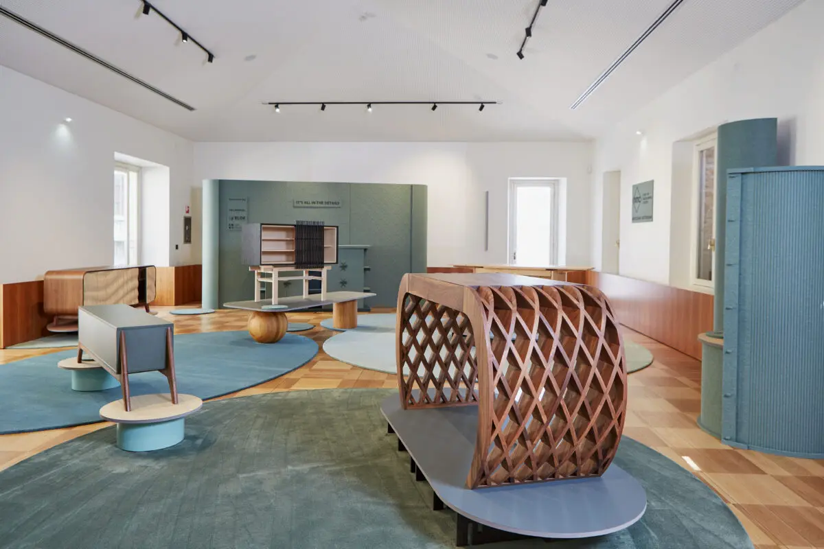 Akuvilt leverde innovatieve, akoestische vilten panelen en werkte samen met ontwerper Karel Bodegom aan een modulaire opbergkast van hetzelfde duurzame materiaal. BLOK Plaatmateriaal en Unilin sponsorden geavanceerde plaatmaterialen zoals Master Oak en Supermat, die vakmanschap en duurzaamheid combineren. Van Besouw ontwierp speciaal voor deze editie op maat gemaakte vloerkleden, die zorgden voor een stijlvolle uitstraling van de gehele stand.