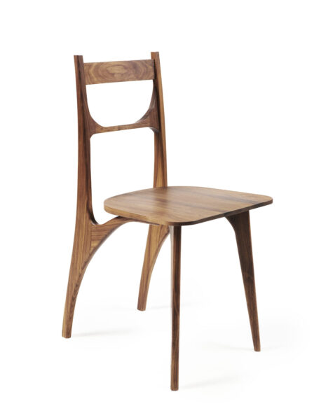 Het ontwerp kenmerkt zich door doorlopende vloeiende lijnen die eindigen in een subtiele druppelvorm, met zichtbare Sam Maloof verbindingen als eerbetoon aan ambacht en traditioneel vakmanschap.