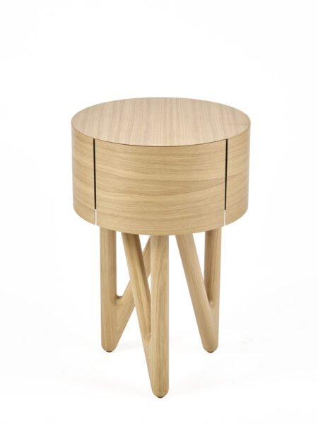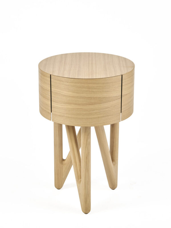 Het verhaal van dit meubel begint met de opdracht voor het ontwerpen van mijn meesterwerkstuk, de afstudeer-opdracht van het 4de leerjaar van het HMC Amsterdam. Hiervoor hadden mijn opa en oma een bijzettafel met een rondblad als wens opgegeven, vanuit mijn opleiding kwam daar de opdracht van een bewegend segment bij. Na schetsen, overleggen en aanpassen is er dit ontwerp uitgekomen: een bijzettafel met een rondblad waarin een lade verwekt is, staande op een doorlopende driepoot. Het blad en de lade zijn rondom zo met eiken fineer bekleed dat de nerf optisch doorloopt. In het meubel zijn kleine verrassende details verwerkt, zoals de Ebben houten zwaluwstaart inleg verbinding in de lade en mijn initialen in de koppel naad van het fineer.