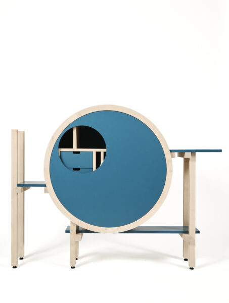 Het ontwerp ontstond uit de combinatie van rondwerk en beweging. Ik heb een ronde esdoornhouten kast ontworpen met een deur die om haar eigen as draait. Door de deur te draaien komt steeds een ander segment in de spotlight en worden de lades toegankelijk. De lichte houtsoort in combinatie met het strakke, blauwe spuitwerk geeft de kast een tijdloze uitstraling. Mijn ervaring met rondwerk vormde de basis voor deze uitdaging: ik wilde niet alleen vorm, maar ook interactie toevoegen. De beweging van de deur voegt een onverwacht element toe. Dit ontwerp valt op door het contrast tussen de ronde romp en de strakke lijnen van het onderstel. De ontwerpen van Gerrit Rietveld zijn een inspiratiebron. Dit is in mijn kast terug te zien in de openheid en geslotenheid, alsook in de horizontale en verticale belijningen. Mijn ontwerp een samensmelting van techniek, esthetiek en een dynamische beleving, zo ontstond ‘Pivot Blue’.