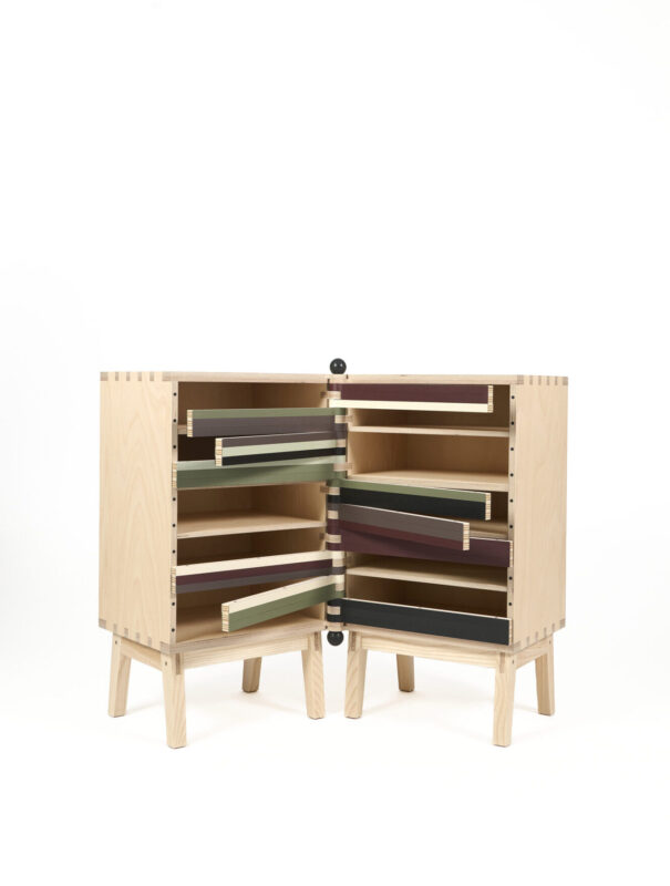 Dit meubel is zelf ontworpen, ontwikkeld en gemaakt. Met name het grote houten scharnier van de draaikastjes was een flinke uitdaging! Ik wilde een meubel maken dat zich aanpast aan verschillende hoeken in huis en waarvan compartimenten flexibel open kunnen staan. Ook heb ik moderne en traditionele houtverbindingen gecombineerd en zichtbaar gelaten in de meubels. De basis van de kastjes is berken multiplex, dat een mooie tekening heeft en goed stijf is. De onderstellen zijn gemaakt van inlands essenhout, een duurzame, lokale houtsoort. Voor de draailamellen en ladefronten is lichter populieren multiplex gebruikt en beplakt met het natuurproduct linoleum (Forbo furniture). Dit mooie, kleurrijke materiaal geeft de meubels een natuurlijke “look & feel”.
