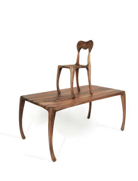 De Drop collectie nodigt uit om samen te komen. Een collectie waarin vorm, functie en vakmanschap tot uiting komen in een organische eettafel en stoel. Alle twee gemaakt uit dezelfde unieke stam inlands Amerikaans notenhout, waarbij de natuurlijke lijnen van het hout het ontwerp ondersteunen.
